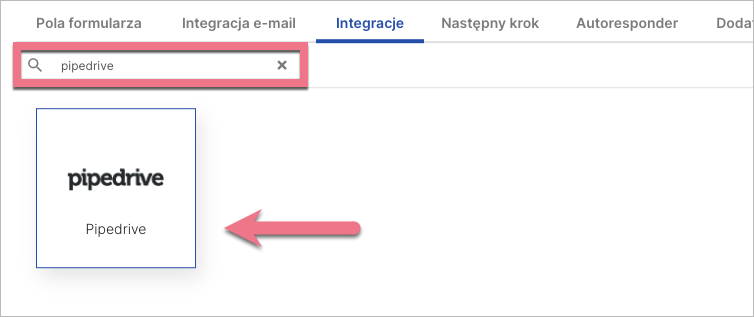 3. W zakładce Integracje wybierz Pipedrive. Wpisz nazwę integracji w wyszukiwarce i kliknij enter.