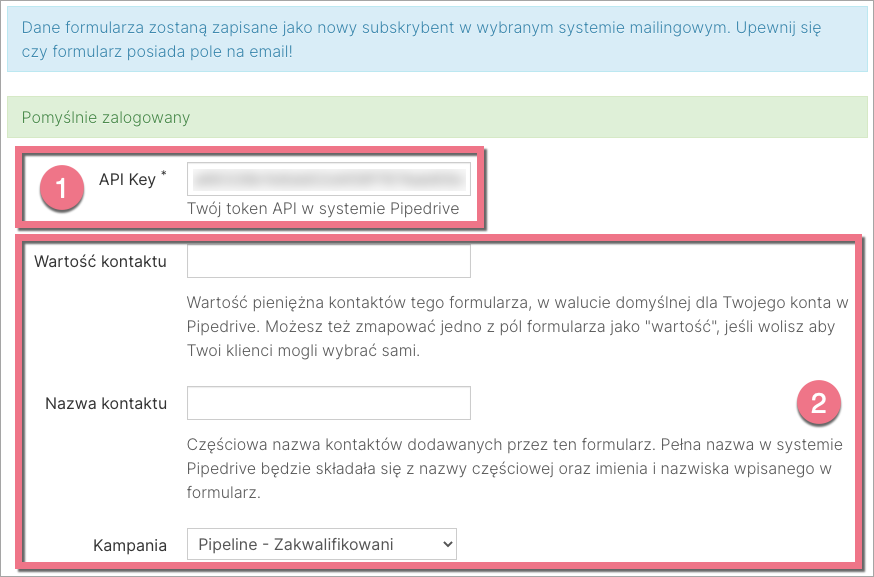 4. W polu API Key (1) wklej token API skopiowany Pipedrive. Uzupełnij pozostałe pola (2).