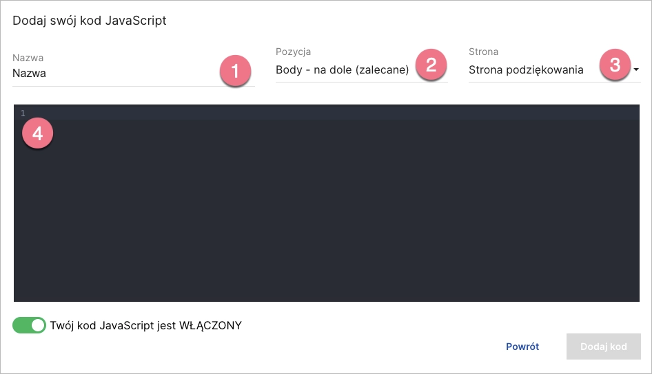 4. Wróć do sekcji JavaScript. Wpisz nazwę (1), wybierz pozycję Body – na dole (2) na Stronie podziękowania (3). Wklej własny kod (4). Kliknij Dodaj kod.
