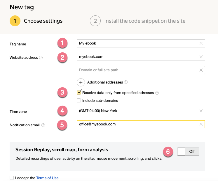 3. Wypełnij potrzebne informacje. Dodaj nazwę tagu (1), wprowadź adres(y) URL (2). Dla jednego tagu możesz dodać wiele stron internetowych, jeśli chcesz gromadzić wszystkie dane łącznie. Wybierz opcję Receive data only from specified addresses (3), aby zapobiec pobieraniu danych z innych stron internetowych. Wybierz strefę czasową (4). Jeśli chcesz otrzymywać powiadomienia e-mail, dodaj swój adres (5). Możesz także włączyć funkcję Session Replay (6) – aktywność użytkowników w formie klipu wideo.