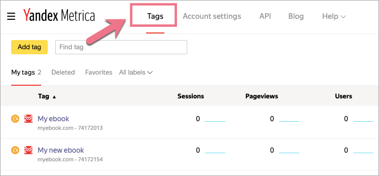 Twój tag Yandex Metrica powinien być teraz aktywny. Dane są dostępne w zakładce Tags.