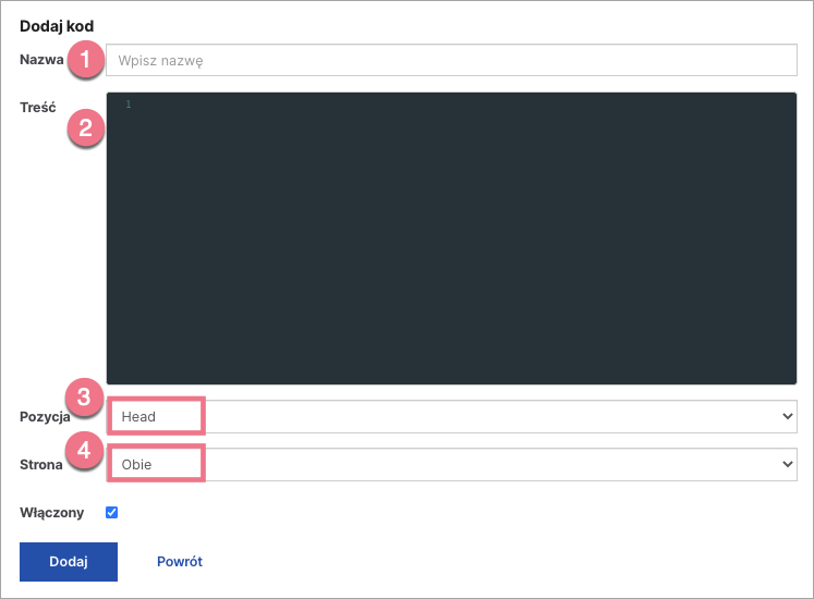 3. Wpisz nazwę (1), wklej kod (2) i wybierz Head (3) i Obie (4). Kliknij w Dodaj.