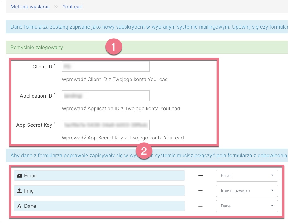 4. Wklej wymagane dane (1). Poczekaj, aż system zaloguje się, i następnie połącz odpowiednie pola formularza z wartościami w YouLead (2).