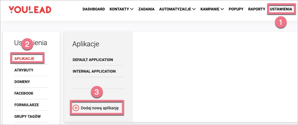 2. Przejdź do zakładki Ustawienia (1) > Aplikacje (2) i kliknij Dodaj nową aplikację (3).