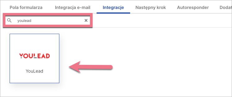 3. W zakładce Integracje wybierz YouLead. Wpisz nazwę integracji w wyszukiwarce i kliknij enter.