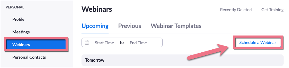 1. Jeżeli chcesz umieścić na swoim landing page’u okno webinaru, przejdź do zakładki Webinars, a następnie kliknij Schedule a Webinar.