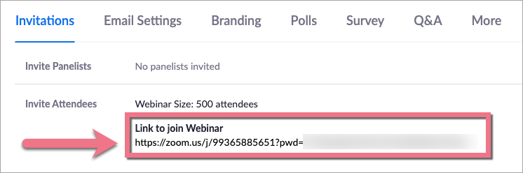 2. Skonfiguruj opcje webinaru i odszukaj zakładkę Invitations. Skopiuj podany tam link.
