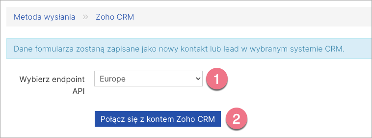 4. W polu Wybierz endpoint API (1) wybierz jedną z opcji (Europe, US lub India), a następnie kliknij Połącz się z kontem Zoho CRM (2).