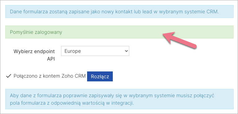 6. Po pomyślnym zintegrowaniu konta Zoho CRM z platformą Landingi w oknie edytora zobaczysz zielony komunikat Pomyślnie zalogowano. Oznacza to, że integracja przebiegła pomyślnie.