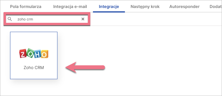 3. W zakładce Integracje wybierz Zoho CRM. Wpisz nazwę integracji w wyszukiwarce i kliknij enter.