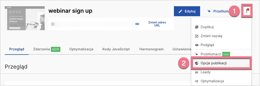 Do opcji publikacji możesz wejść także z poziomu Dashboardu landing page’a: