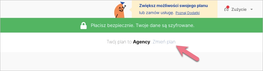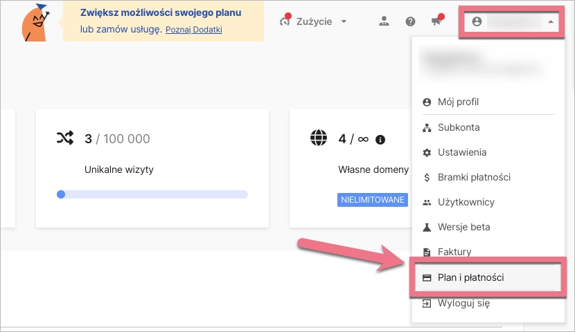 2. W górnym panelu przejdź do rozwijanego menu. Kliknij w zakładkę Plan i płatności.