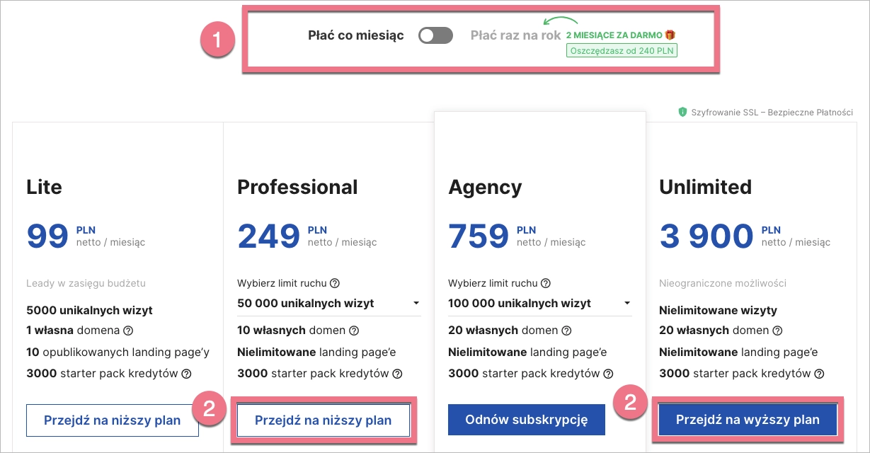 4. Wybierz sposób rozliczania (1) i zdecyduj, czy chcesz przejść na wyższy czy niższy plan (2).