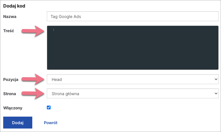 12. Nazwij swój kod i wklej wygenerowany wcześniej w Google Ads kod w polu Treść. Wybierz pozycję Head na Stronie, która ma być śledzona. Kliknij Dodaj.