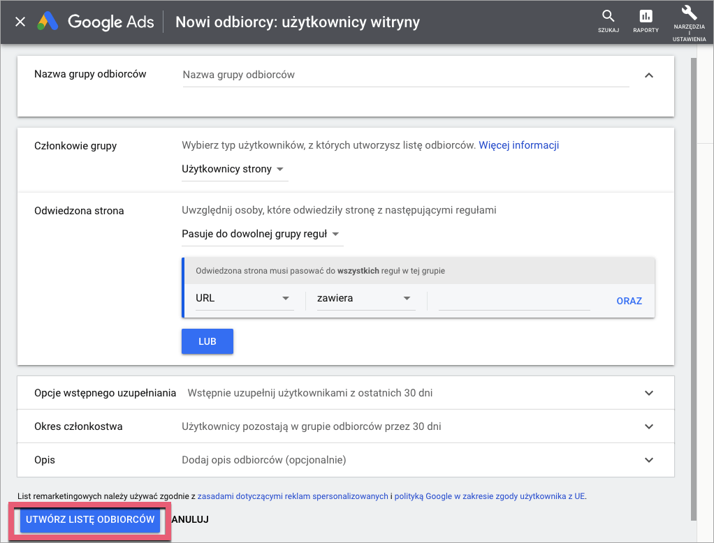 3. W oknie Nowi odbiorcy: użytkownicy witryny wpisz nazwę grupy odbiorców (np. Remarketing [nazwa strony] wszyscy) oraz zdefiniuj inne, wybrane parametry.