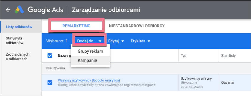 4. W zakładce Remarketing zobaczysz na liście utworzoną przez Ciebie listę odbiorców. Zaznacz ją, następnie kliknij Dodaj do… i wybierz grupę reklam Twojej kampanii remarketingowej, którą masz już przygotowaną. Jeżeli nie masz przygotowanej jeszcze kampanii remarketingowej, to po jej konfiguracji w sekcji Odbiorcy kampanii będziesz mógł wybrać z “W jaki sposób weszli w interakcję z Twoją firmą” powyższą listę zdefiniowanych odbiorców.