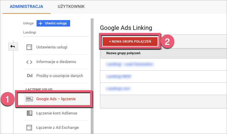 2. W sekcji Łączenie usług wybierz Google Ads – łączenie. Następnie kliknij w + Nowa grupa połączeń i wybierz konto Google Ads na którym znajduje się kampania, którą chcesz śledzić i skonfiguruj połączenie, nie zapominając o przesunięciu suwaka “Wszystkie dane witryny”.