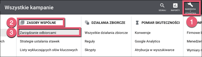 1. Zaloguj się na swoje konto w usłudze Google Ads, następnie w górnym panelu przejdź do sekcji Narzędzia i ustawienia > Zasoby wspólne > Zarządzanie odbiorcami.