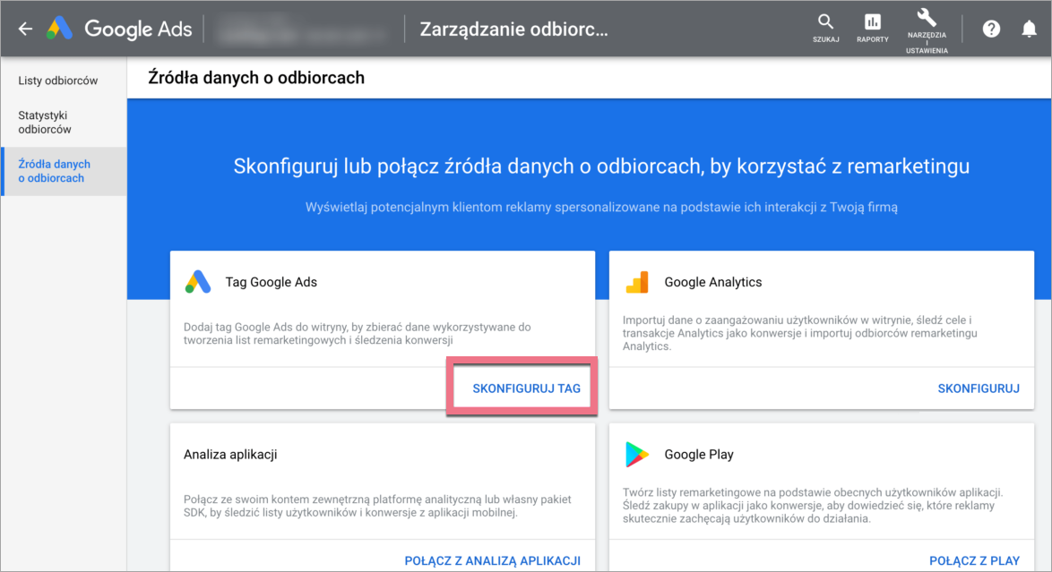 5. Zdefiniuj źródła danych o tych odbiorcach. Ponownie wróć do zakładki Narzędzia i ustawiania > Zasoby wspólne > Zarządzanie odbiorcami. W lewym menu przejdź do zakładki Źródła danych o odbiorcach. W kolejnym oknie wybierz Tag Google Ads i kliknij w przycisk Skonfiguruj tag.