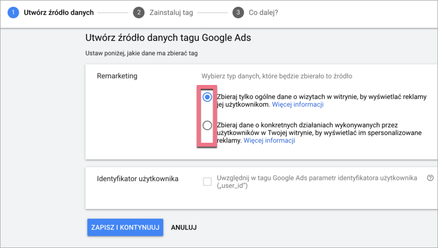6. Utwórz źródło danych tagu Google Ads, wybierając typ zbieranych danych w oknie Remarketing. Zapisz i kontynuuj.