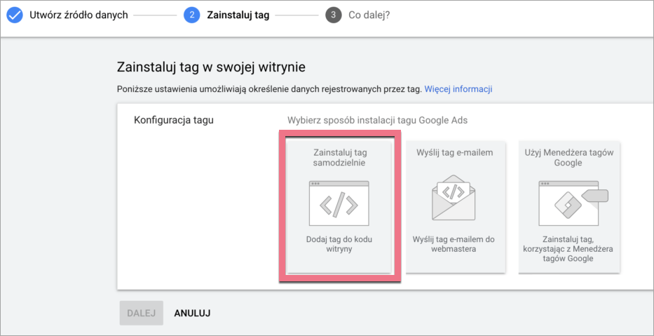 7. W następnym kroku kliknij w kafelek Zainstaluj tag samodzielnie.