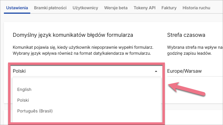 2. Wybierz domyślny język komunikatów błędów formularza dla wszystkich landing page’y.