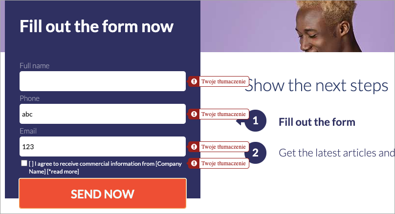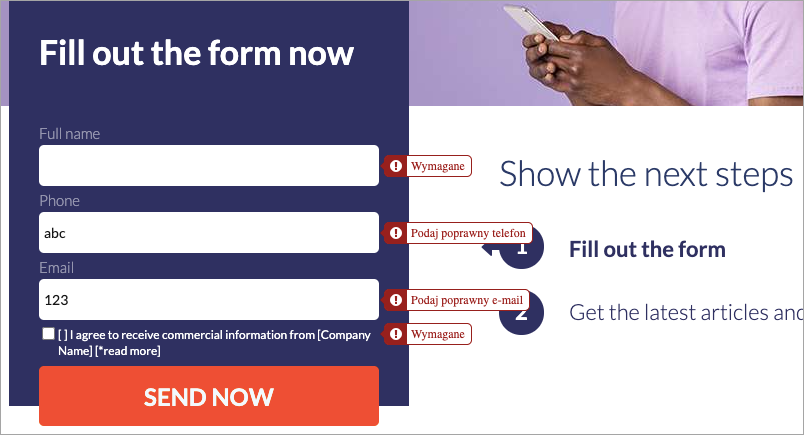 Komunikaty błędów to informacje, które pojawiają się, gdy użytkownik wprowadzi nieprawidłowe dane do formularza na landing page’u. Domyślnie ich językiem jest język Twojego konta w Landingi. Aby zmienić treść komunikatów błędów formularza lub je przetłumaczyć, zmień domyślny język konta, landing page’a, pop-upu lub lightboxa bądź dodaj własny kod JavaScript.