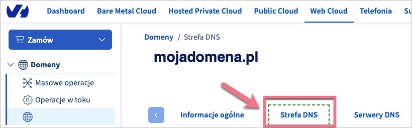 Przejdź do ustawień strefy DNS w OVH