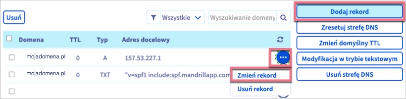 1. Dodaj nowy rekord A dla subdomeny, którą chcesz dodać do Landingi. Jeżeli już posiadasz taki rekord, edytuj (Zmień) jego wartości.