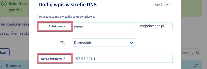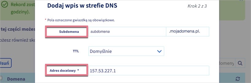 tylko nazwa Twojej subdomenyAdres docelowy: