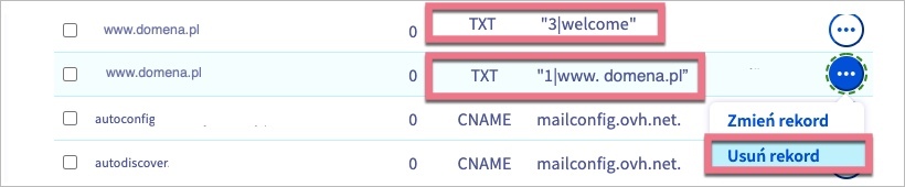 1. Usuń dwa domyślne rekordy TXT dla subdomeny www o wartości „3|welcome” oraz „1|www.twojadomena.pl„. Sprawdź obie strony listy rekordów.