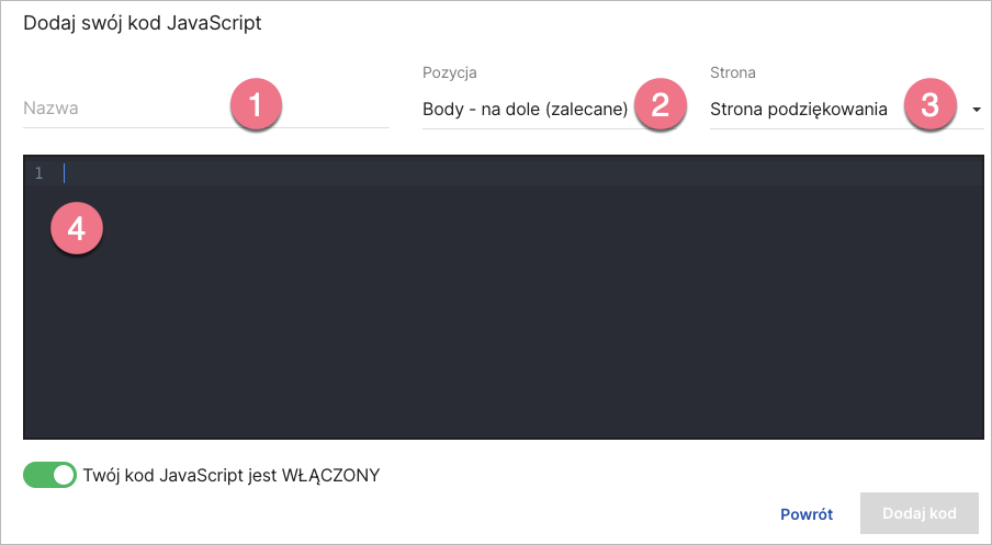 Nadaj nazwę (1) i wybierz pozycję Body – na dole (2) na Stronie podziękowania (3). Wklej kod w pole treści (4). Zapisz, klikając Dodaj kod.