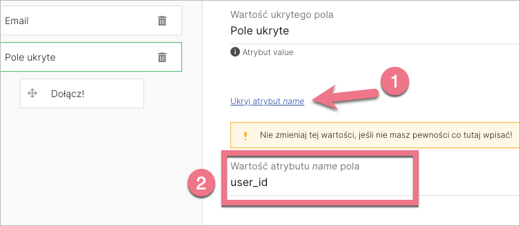 3. Kliknij Pokaż atrybut name (1) i zmień wartość atrybutu name pola na: user_id (2). Następnie Zapisz i zamknij.