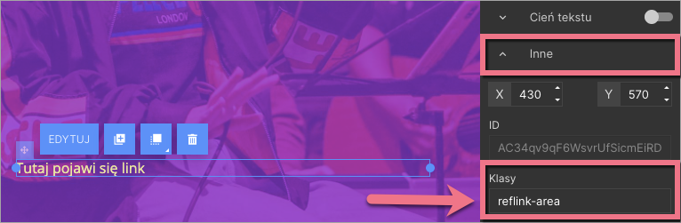 6. W toolbarze po prawej stronie odszukaj zakładkę Inne i wpisz reflink-area w polu Klasy.