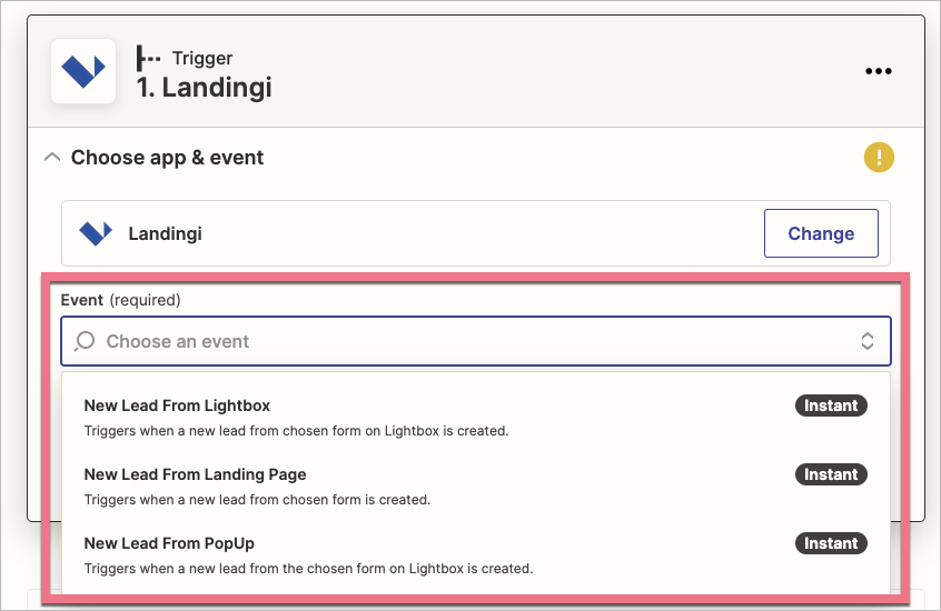 - W oknie Event wybierz odpowiednio New Lead From Landing Page, New Lead From Lightbox, New Lead From PopUp w zależności od tego, co chcesz zintegrować.