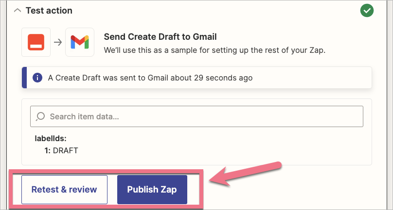W sekcji testowania akcji (Test action) kliknij Test & Review lub Test & Continue. Jeżeli test zostanie zakończony pomyślnie, opublikuj Zapa (Publish Zap).