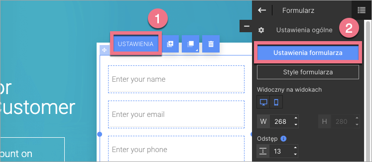 1. Kliknij w formularz i wejdź w Ustawienia z menu podręcznego (1) lub panelu bocznego (2).