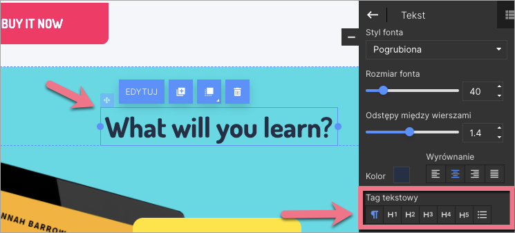 2. W ustawieniach widgetu w panelu po prawej wybierz tag H1, H2 bądź inny.