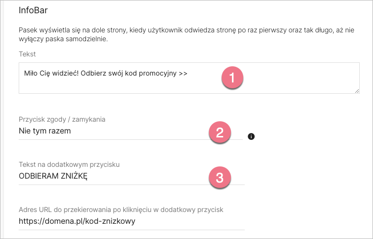 2. Uzupełnij pola Tekst (1) oraz Przycisk zgody / zamykania (2). Dodatkowy przycisk (3) możesz wykorzystać, aby przekierować użytkownika na inną stronę (adres URL).