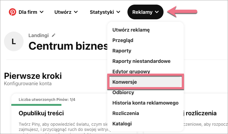 1. Przejdź do swojego konta Pinterest i z menu górnego wybierz Reklamy, a następnie Konwersje.