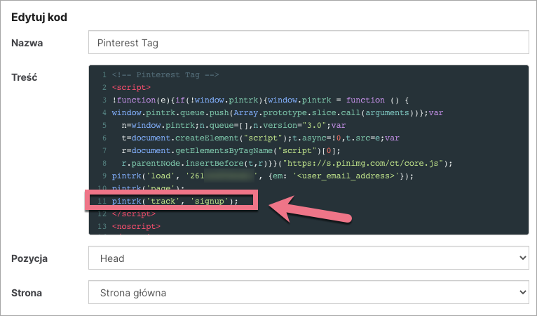 Aby umożliwić Pinterestowi śledzenie odwiedzających Twojego landing page’a oraz działań podejmowanych przez nich po wyświetleniu reklamy na Pintereście, dodaj do swojej strony tag Pinteresta.