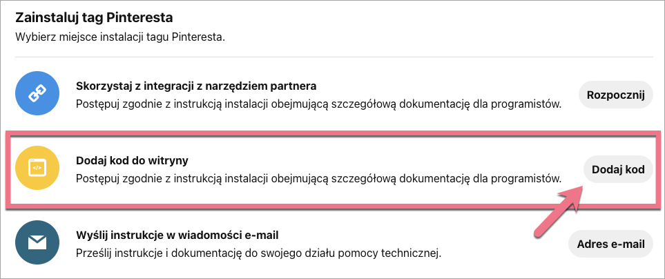 3. Zeskroluj w dół i w sekcji Zainstaluj tag Pinteresta w polu Dodaj kod do witryny kliknij Dodaj kod.
