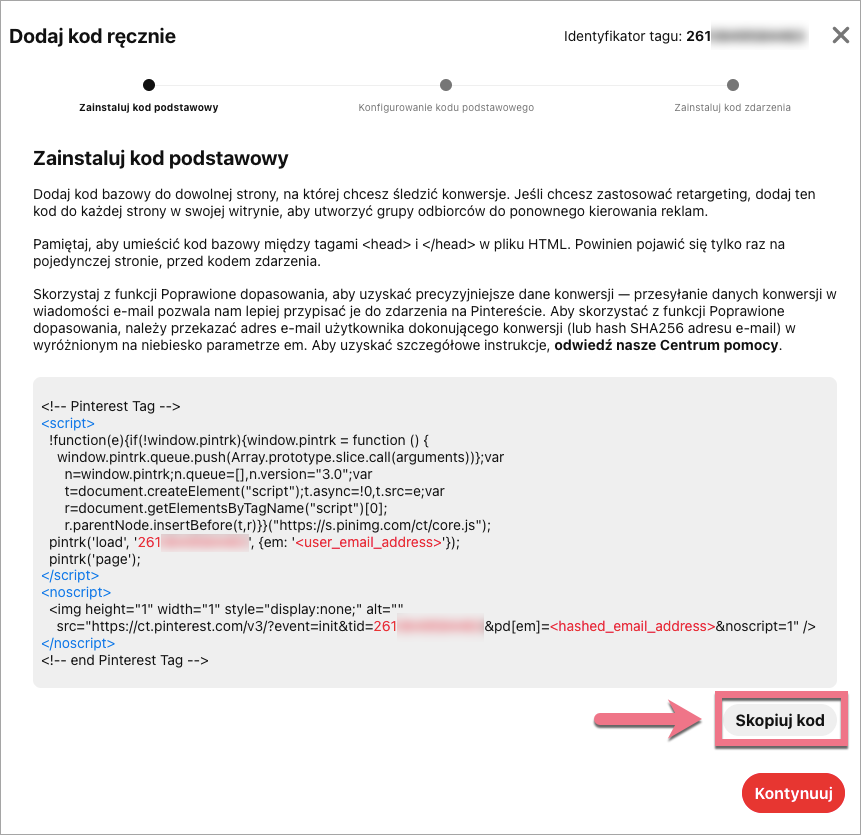 4. Zobaczysz okno konfiguracji tagu (kod podstawowego). Przewiń w dół i kliknij Skopiuj kod.