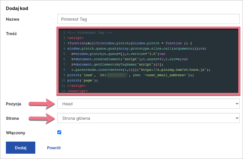 3. Nadaj nazwę i wklej skopiowany kod w polu Treść. Wybierz pozycję Head na Stronie głównej. Kliknij Dodaj.