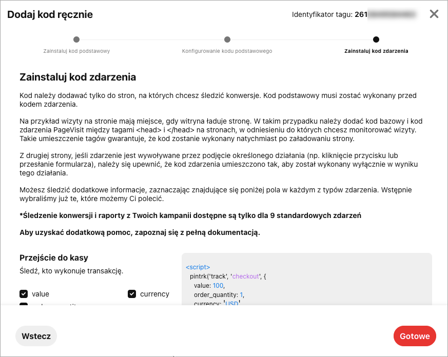 Jeżeli chcesz dodać kod śledzący także do strony podziękowania (strony po konwersji), dodaj jeszcze jeden kod JavaScript i wybierz Stronę podziękowania.