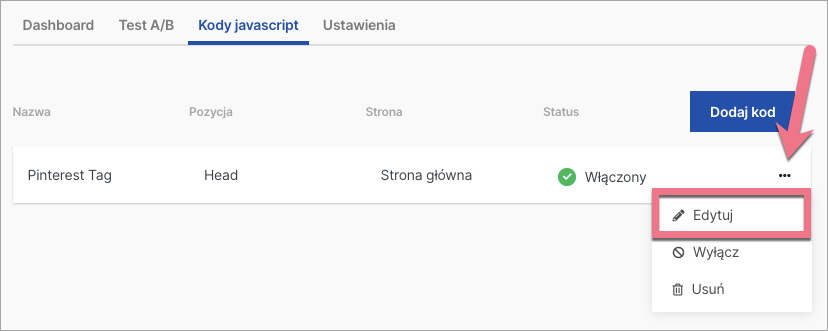 7. Przejdź do zakładki Kody JavaScript i edytuj dodany przed chwilą kod.