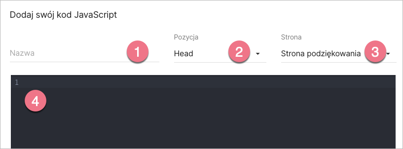 Nadaj mu nazwę (1) i wybierz pozycję Head (2) na Stronie podziękowania (3). Wklej ten sam kod w pole treści (4). Zapisz, klikając Dodaj kod.