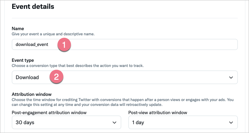 2. Nazwij event (1) i wybierz jego rodzaj (2). Dostosuj pozostałe ustawienia. Kliknij Next.
