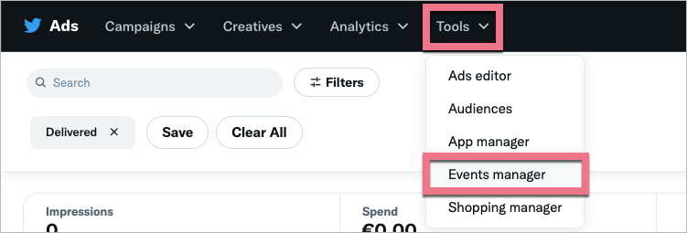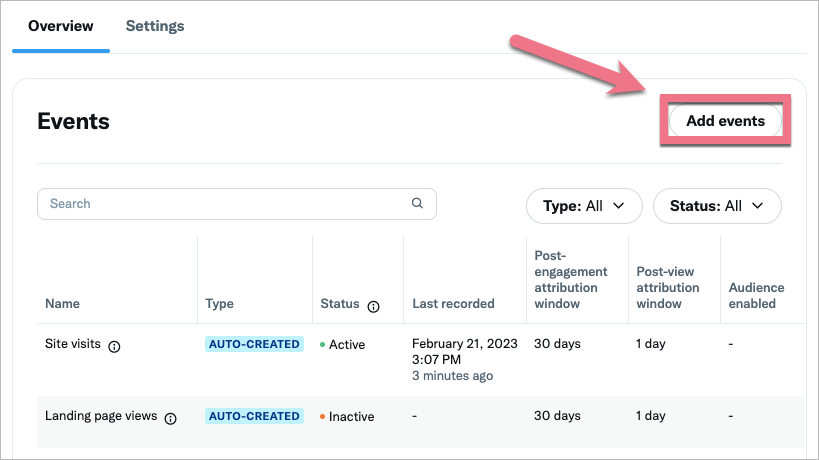1. Aby utworzyć kod zdarzenia w Twitterze, przejdź do Events manager > Overview i kliknij Add events.