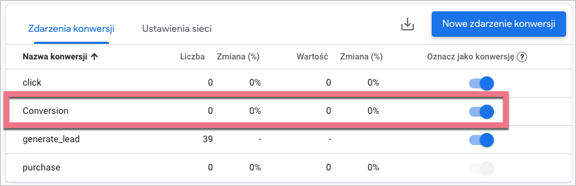 2. Domyślnie konwersja z pop-upu to wydarzenie nazwane Conversion. Aby GA4 mogło śledzić wypełnienia formularza na pop-upie, musisz oznaczyć to wydarzenie jako konwersję.
